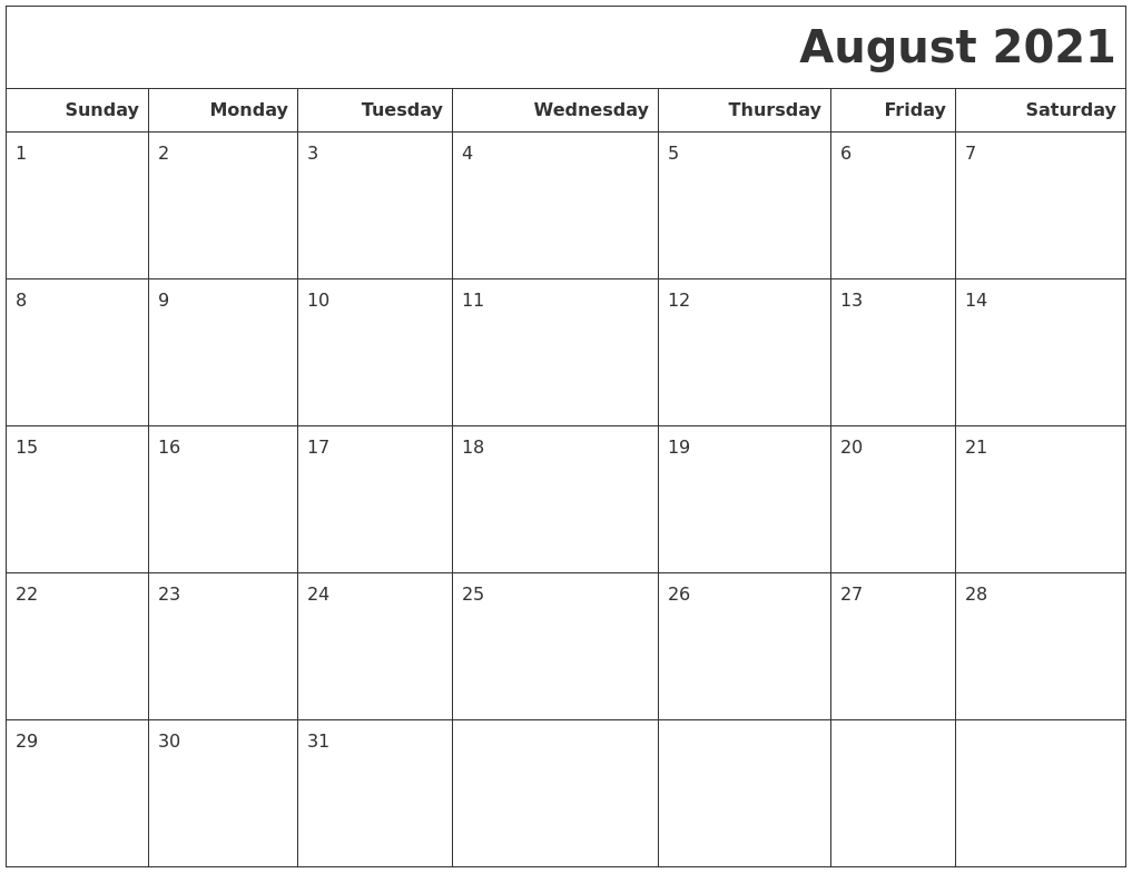 Print august 2021 calendar and enter your holidays, events and appointments.